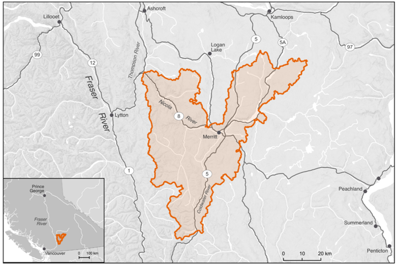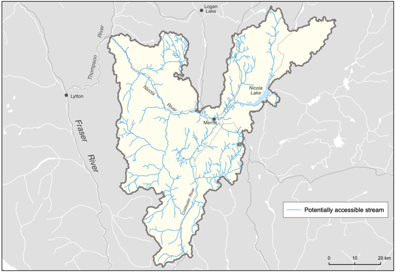 The primary geographic scope of this WCRP is the Lower Nicola River watershed, located in the Thompson drainage basin of the Fraser River system in south-central British Columbia drainage area 376,064 ha; (Figure 1.1). The scope constitutes the Lower Nicola “watershed group” as defined by the British Columbia Freshwater Atlas (FWA), which excludes the Guichon Creek drainage and the Nicola River and Quilchena Creek drainages upstream of Nicola Lake. A consistent spatial framework was necessary to undertake a watershed-selection process at the provincial scale to identify target watersheds to improve freshwater connectivity for salmonids. The Lower Nicola River watershed was identified by the B.C. Fish Passage Restoration Initiative as one of four target watersheds for WCRP development (Mazany-Wright et al. (2021c)). Culturally and economically important populations of Chinook Salmon (Oncorhynchus tshawtyscha), Coho Salmon (Oncorhynchus kisutch), and the anadromoius life history of Rainbow Trout commonly referred as steelhead (Oncorhynchus mykiss) are all found in the watershed, which historically supported Indigenous sustenance and trading economies (Table 1.1; Lower Nicola Indian Band (2015), ESSA Technologies Ltd. and Fraser Basin Council (2019), Coldwater Band (2021)).
